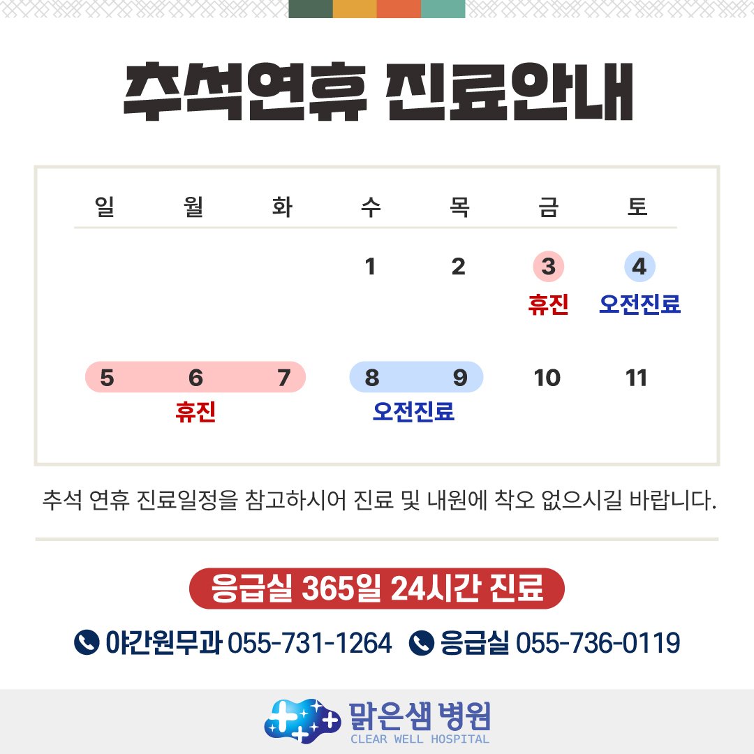 [진료안내] 추석연휴 진료안내 페이지 정보 작성자 최고관리자 댓글 0건 조회 337회 작성일 25-09-23 14:44 본문 목록 이전글독감 무료 예방접종 안내 (2025-26절기) 25.09.25 다음글[진료안내] 6월 진료안내 25.05.19 댓글목록 댓글목록 등록된 댓글이 없습니다.