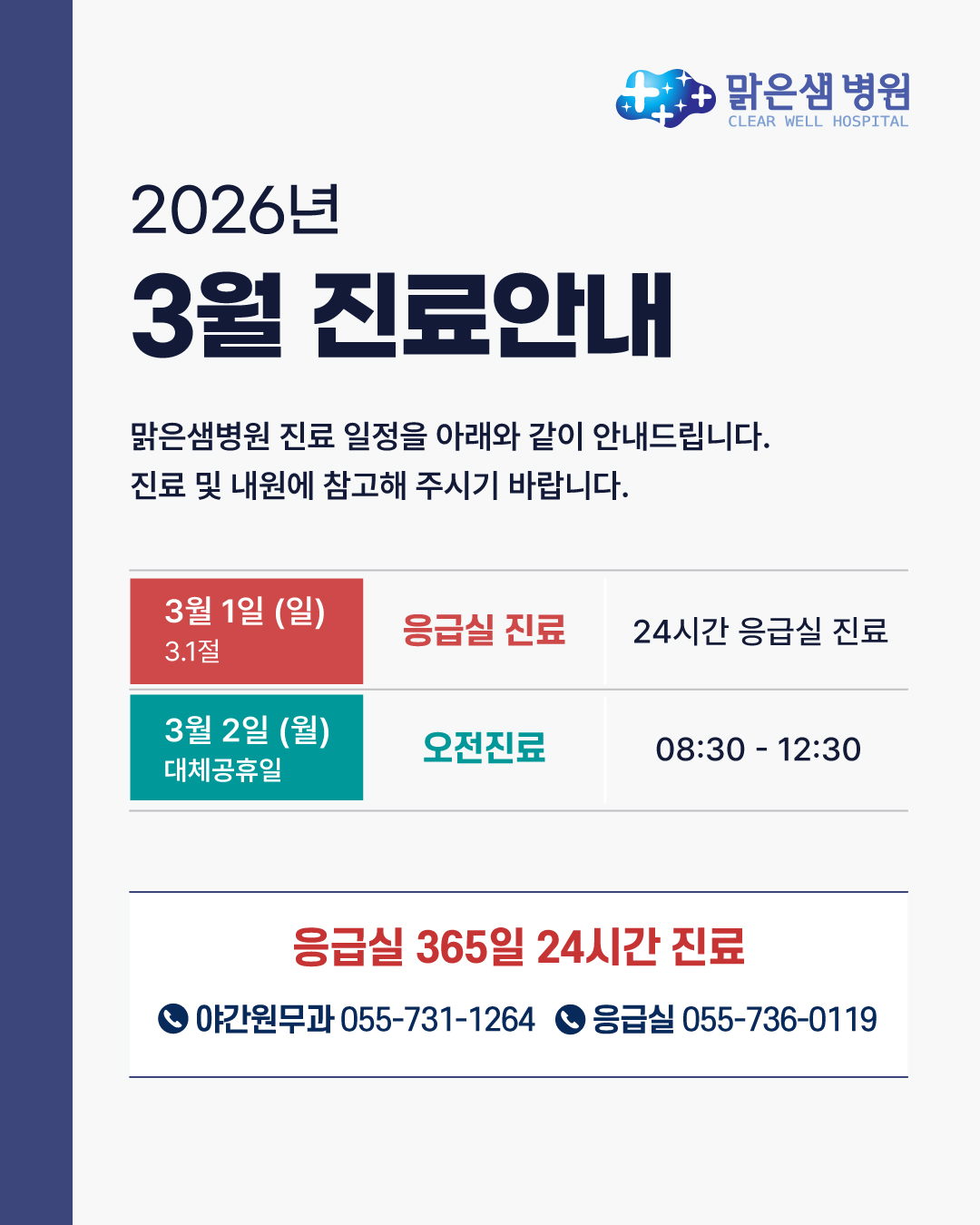 [진료안내] 3월 진료안내 페이지 정보 작성자 최고관리자 댓글 0건 조회 15회 작성일 26-02-26 09:37 본문 목록 이전글 다음글[진료안내] 2월 설연휴 진료안내 26.02.04 댓글목록 댓글목록 등록된 댓글이 없습니다.