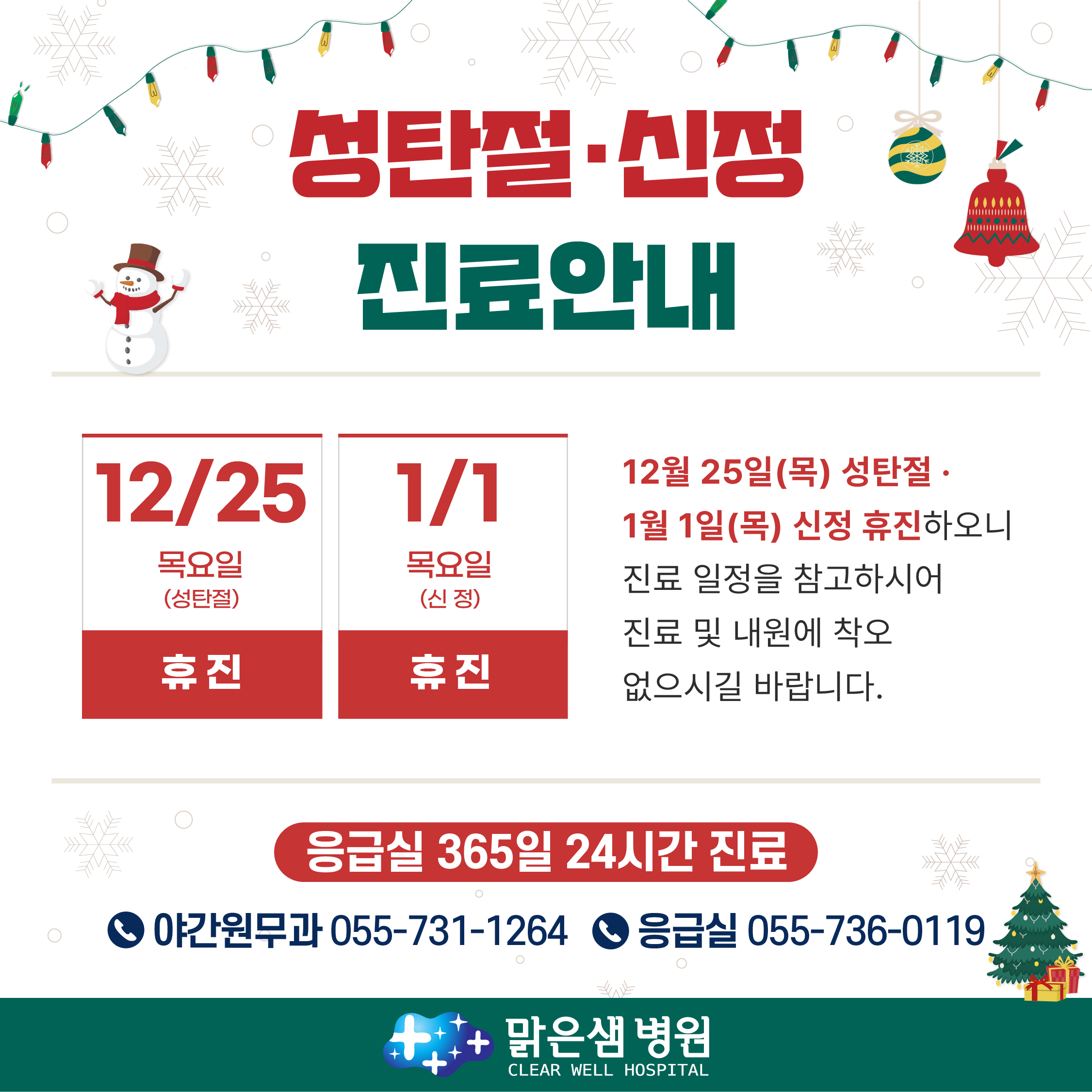 [진료안내] 성탄절·신정 진료안내 페이지 정보 작성자 최고관리자 댓글 0건 조회 49회 작성일 25-12-15 14:41 본문 목록 이전글 다음글국화분재 작품 기증 25.11.24 댓글목록 댓글목록 등록된 댓글이 없습니다.