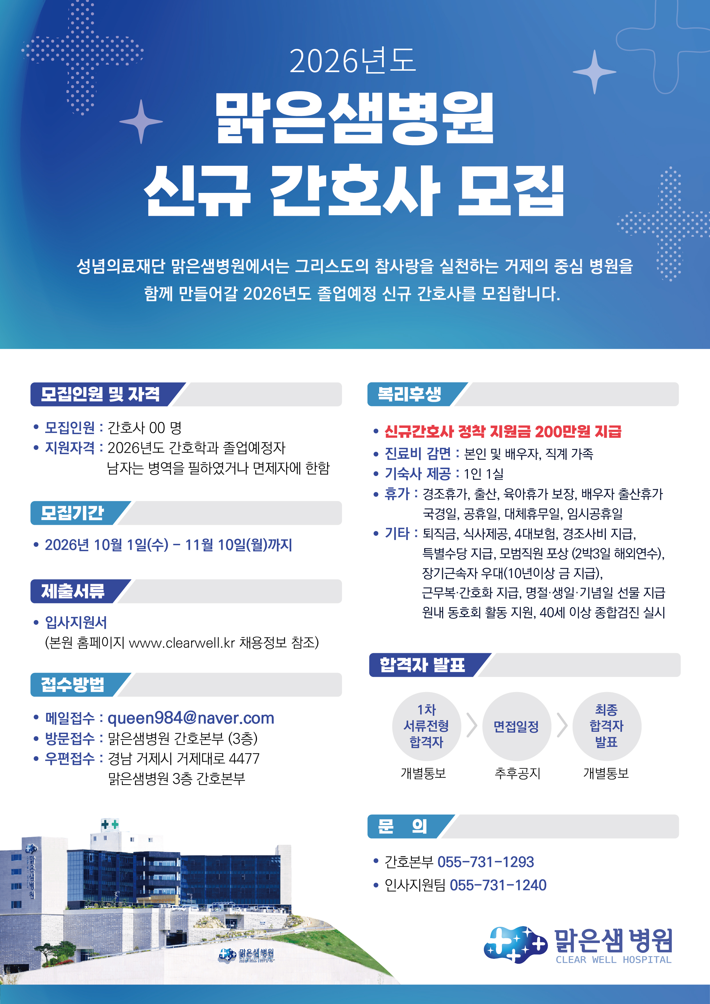 2026년도 맑은샘병원 신규간호사 모집 페이지 정보 작성자 최고관리자 댓글 0건 조회 163회 작성일 25-10-14 15:44 본문 목록 글쓰기 이전글 다음글원무팀 직원을 모집합니다. (마감) 25.03.20 댓글목록 댓글목록 등록된 댓글이 없습니다.